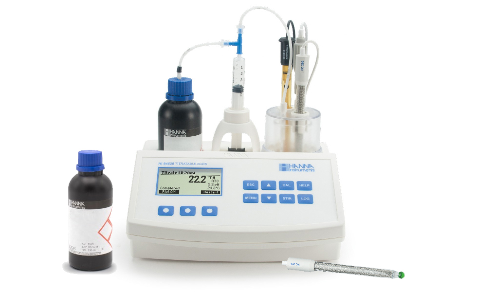 Este equipo se suministra completo para realizar las mediciones de bajo y alto intervalo de acidez titulable. Todos los reactivos vienen preparados y envasados incluyendo las soluciones de titulación valoradas y la solución de calibración de la bomba. No hay necesidad de emplear material de vidrio volumétrico o balanzas analíticas.